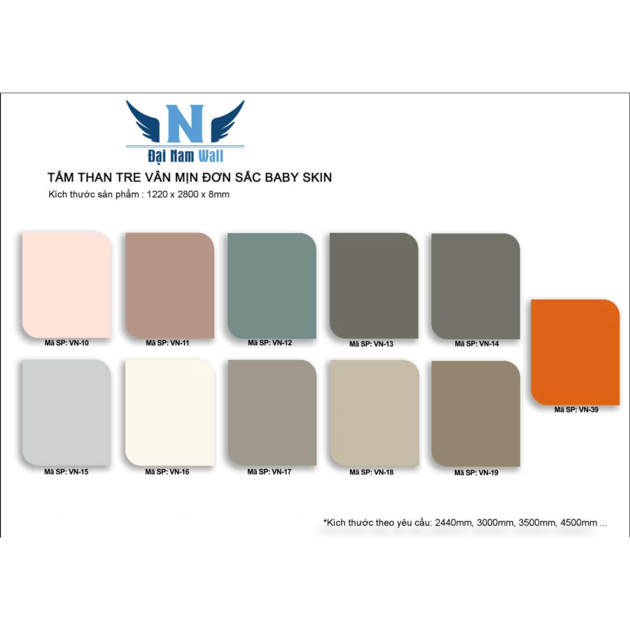 Khám phá bộ sưu tập tấm ốp than tre vân mịn đơn sắc Baby Skin từ Đại Nam Wall. Bề mặt siêu mịn, màu sắc pastel thời thượng (VN-10 đến VN-19, VN-39), giải pháp hoàn hảo cho không gian nội thất tối giản và hiện đại.